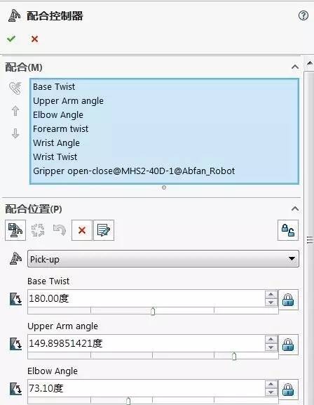 比如这样一个机械手臂,我们可以事先定义好它的配合关系,目前配合控制器里支持的配合主要为平移、旋转、角度和对齐。打开配合控制器后,可以看到装配体中能被用来设置配合控制的运动已经被收录了进来。