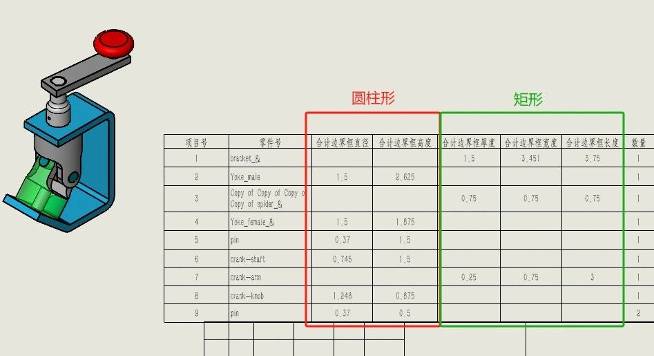这时可将模型的最大外形尺寸自动添加到材料明细表(BOM)中。