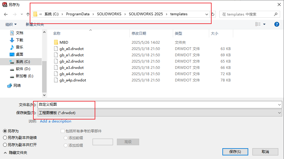 6、将创建好的视图更改文件名,将保存类型改为“工程图模板”并保存到如下路径中。
