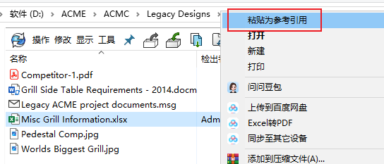 3.右键单击excel选择粘贴为参考引用,单击确定,检入excel