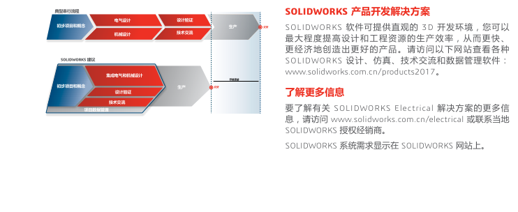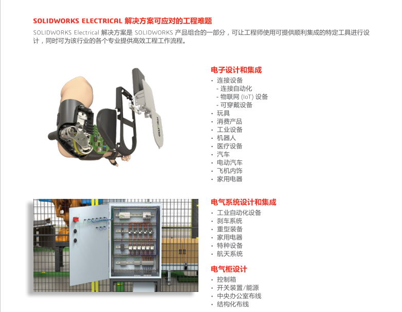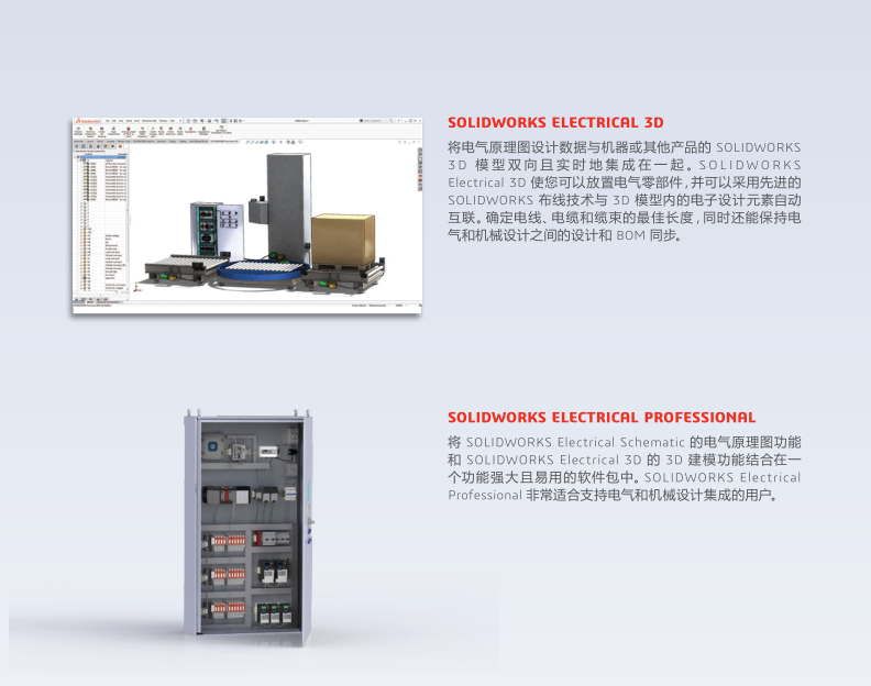 • Electrical 3D:来自 SOLIDWORKS Electrical Schematic 的电气原理图设计数据与 SOLIDWORKS 3D CAD 模型实现双向集成。