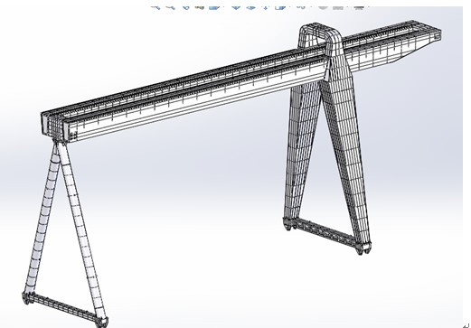 不同的产品行业都有相应的产品特点,如何将产品的特点完美的与软件结合是软件能否得到成功运用的关键。在起重机行业运用建模过程中:首先要合理布局,一定要注意到三个基本视图的重要性。特征的草图与基本视图的合理关联对零件的参数化十分重要。完善零件的设计意图,同一个零件可以通过不同的特征来实现建模,但是相比有一个是相对比较科学合理的,设计意图对零件以后的修改、参数化设计很重要。结合零件的造型特点,要善于运用建模特征工具中的“镜向”。其次,要注意建模特征的“父子关系”。在尺寸驱动与关系驱动的选择中,要侧重后者的使用,因为后者会更利于的产品的系列化设计。对相似零件的建模要善于运用“配置”功能,只要建一个零件模型,然后再对零件特征进行配置,合理地使用配置,对产品系列开发与管理有非常重要的意义。配置使产品的设计快速有效和最大限度地减少了重复设计。同时,由于系列化的操作是在同一文件下进行,大大减少了设计的错误。要修改模型,只需要在零件的系列零件表更改数据就可以了,模型就会自动更新。用系列化法建模使模型修订起来更加容易,也就是说系列化法建模有利于零件复用和PDM管理。对常用的型材可以制作成焊件轮廓文件(例如:小车轨道),保存到软件系统指定的位置。起重机的一些其它系列化的部件,例如驾驶室、行走机构等等,软件的实体建模、钣金建模很好的完成相应的设计工作,实现参数化,提高设计的效率。下图为起重机主结构的建模成果。