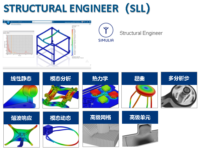 Structural Engineer(SLL)结构工程师,是3DEXPERIENCE平台上的一个结构仿真角色,其在SRD的基础上增加了谐波响应和模态动态分析。同时SLL也支持高级网格和高级单元,多分析步功能也可以在SLL中使用,帮助工程师更好的模拟真实工况。SLL支持以下类型的模拟: