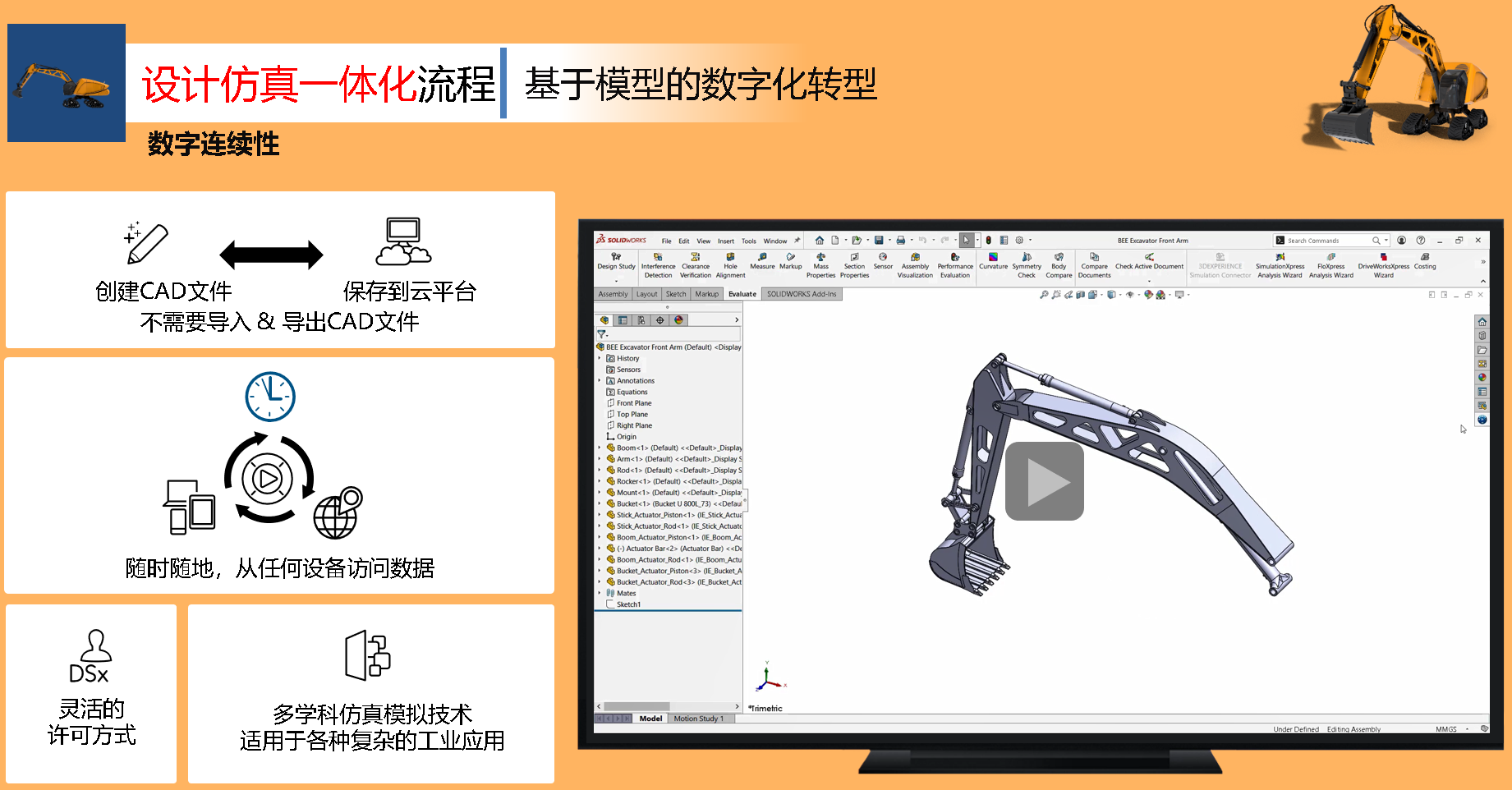 除了本身的仿真功能以外,平台仿真角色能够与桌面CAD软件实时互联,通过将SOLIDWORKS的三维数据与平台仿真功能打通,实现MODSIM设计仿真一体化。