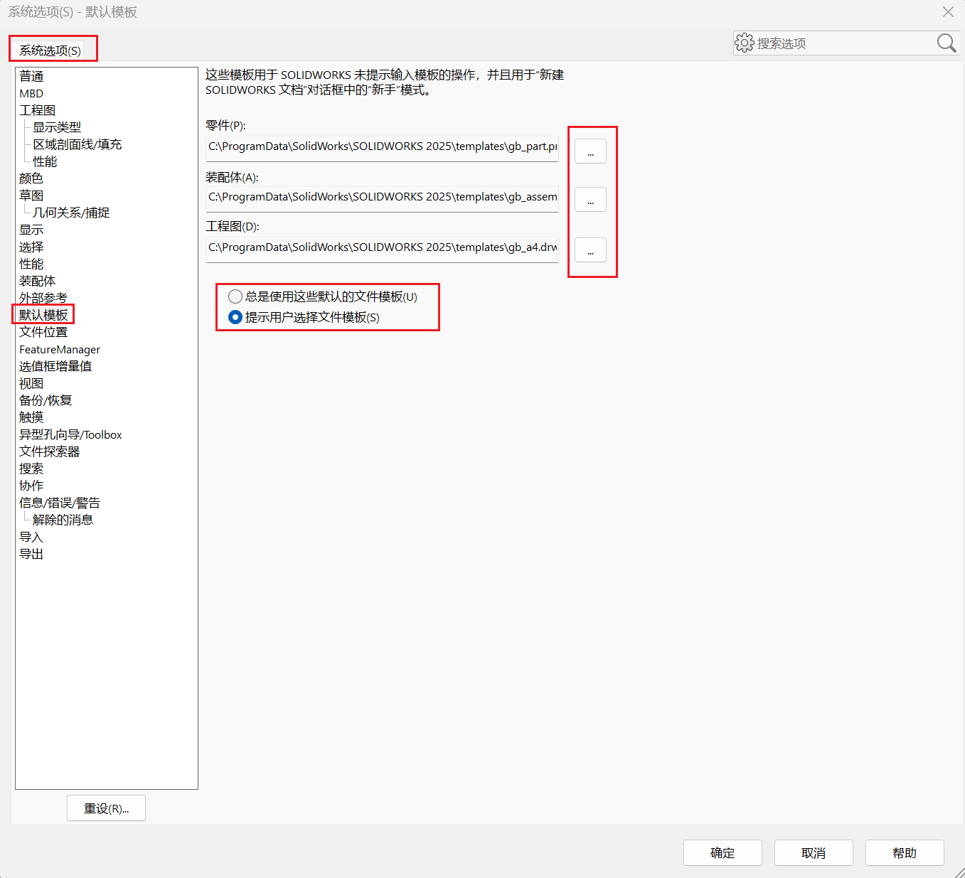 在添加SOLIDWORKS文件模板路径后,可以对默认模板进行设置,将默认模板设置为企业专用模板。