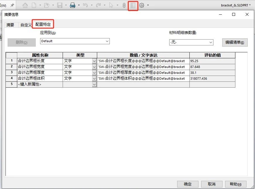 这时可将模型的最大外形尺寸自动添加到材料明细表(BOM)中。