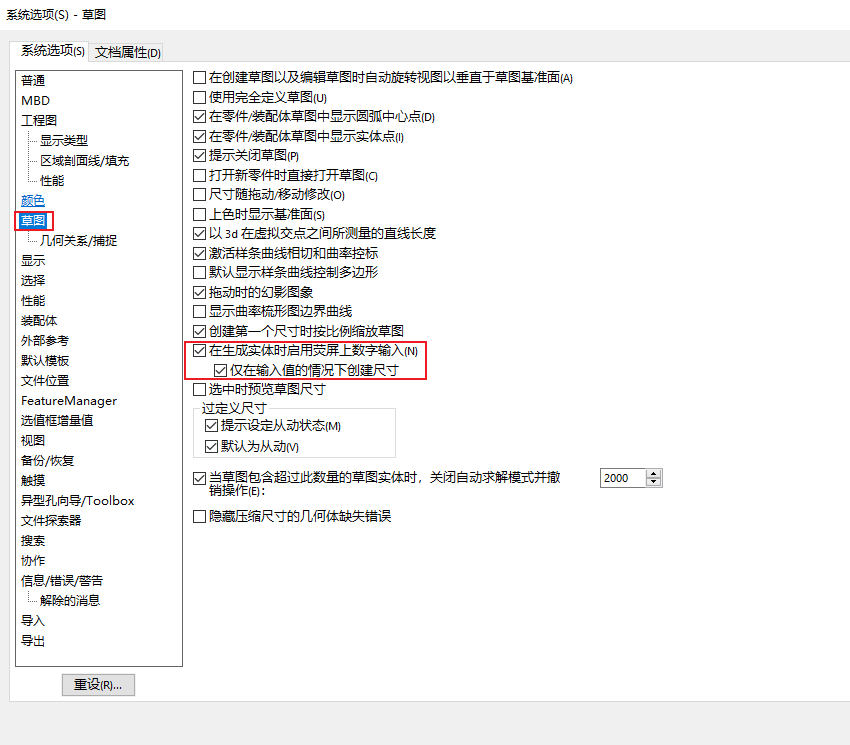 首先我们需要在设置中打开数字草图输入的选项,打开设置-系统选项-草图勾选在成实体时启用荧屏上数字输入和仅在输入值的情况下创建尺寸。
