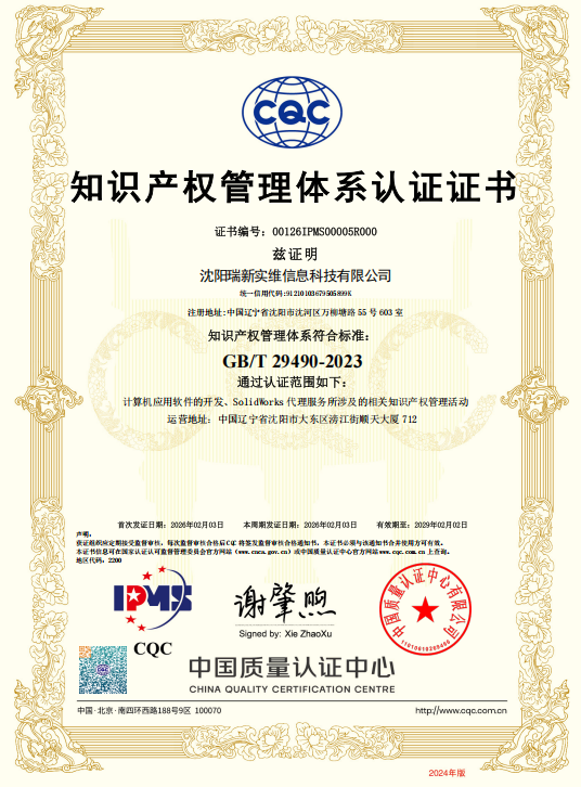 此次认证覆盖公司计算机应用软件的开发及 SolidWorks 代理服务全流程,标志着瑞新实维在知识产权创造、运用、保护和管理方面已达到国家级标准,为企业创新发展与核心竞争力提升奠定了坚实基础。
