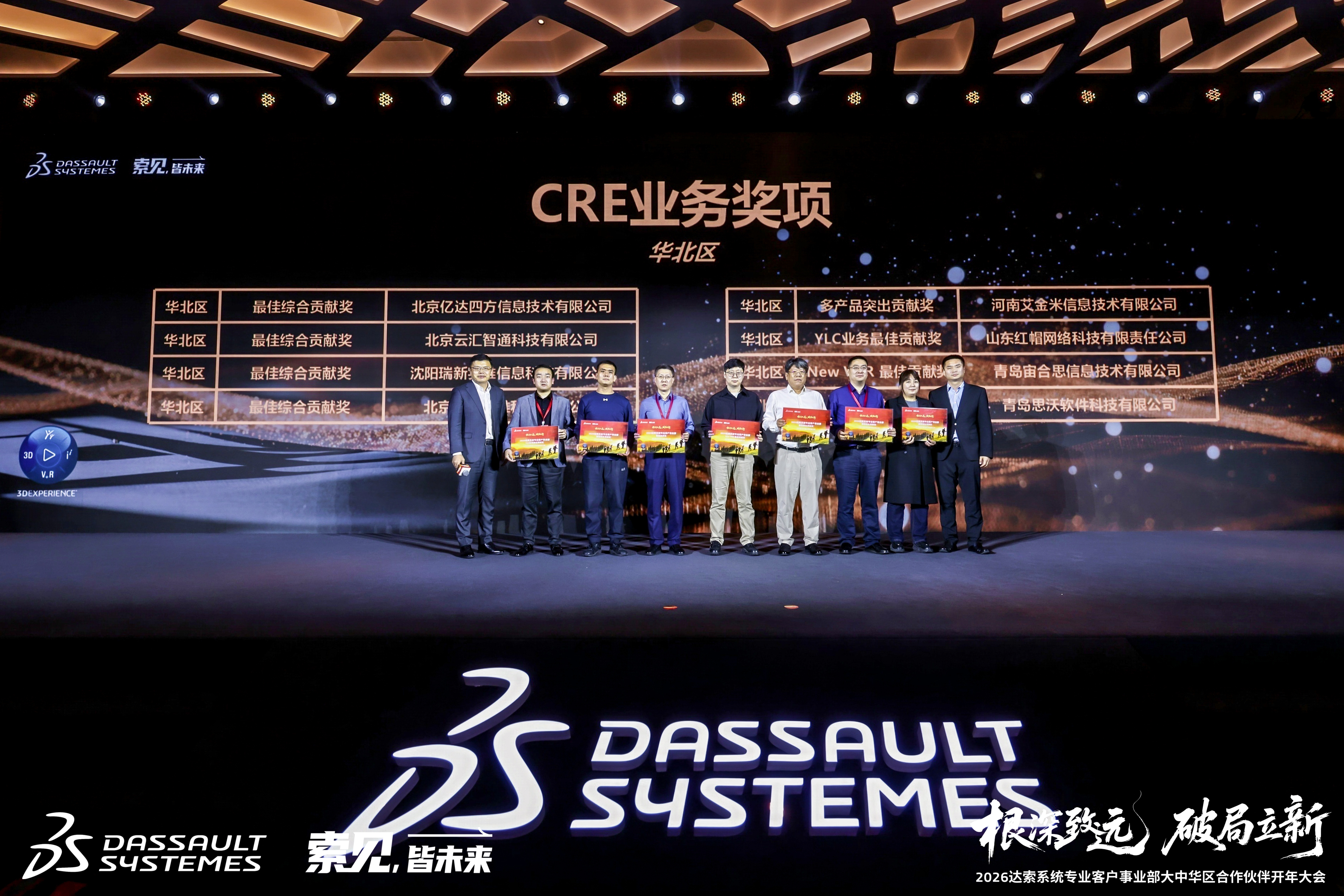 近日,以“固本、破局、立新”为主题的2026达索系统专业客户事业部大中华区合作伙伴开年大会在成都盛大落幕,达索系统全球高级副总裁Gian Paolo BASSI、亚太区及大中华区核心管理层与全国150+顶尖合作伙伴齐聚一堂,共探数字化转型新路径,共绘行业发展新蓝图。沈阳瑞新实维信息科技有限公司(以下简称“瑞新实维”)凭借卓越的技术实力、完善的服务体系以及在华北区域市场的突出贡献,从众多合作伙伴中脱颖而出,成功斩获“CRE华北区最佳综合贡献奖”,这是达索系统对瑞新实维过往合作成果与综合服务能力的高度认可与权威背书。