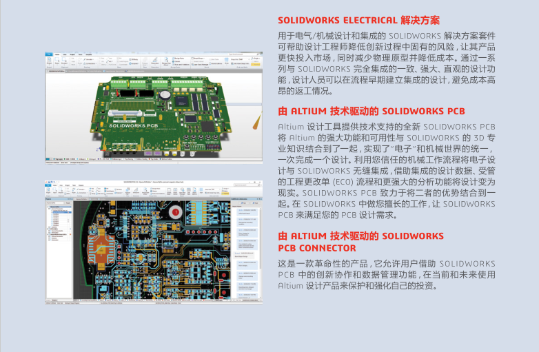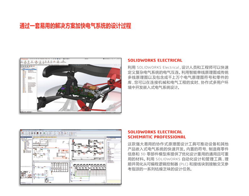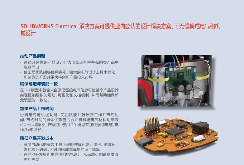 • Electrical 3D:来自 SOLIDWORKS Electrical Schematic 的电气原理图设计数据与 SOLIDWORKS 3D CAD 模型实现双向集成。